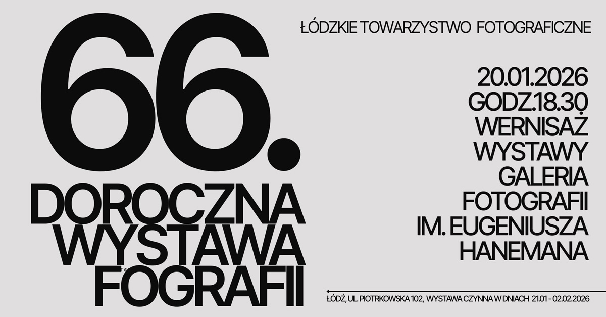 Zapraszamy 20 stycznia 2026 roku, o godz. 18.30 do Galerii Fotografii im. Eugeniusza Hanemana w Łodzi na wernisaż "66. Dorocznej Wystawy Fotografii Łódzkiego Towarzystwa Fotograficznego" połączony z wręczeniem medali i dyplomów ŁTF za twórczość artystyczną. Wystawa potrwa do 2 lutego 2026 roku. Wstęp wolny.