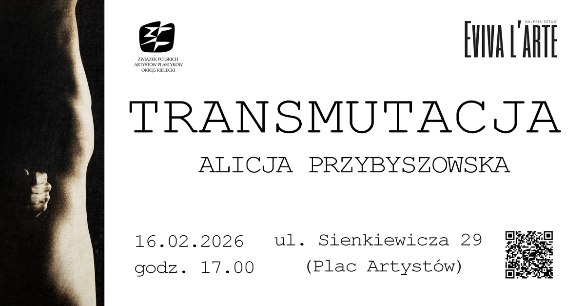 Galeria Eviva L'arte w Kielcach, zaprasza 16 lutego 2026 roku, o godz. 17.00 do galerii na wernisaż wystawy fotografii Alicji Przybyszowskiej "Transmutacja", będzie to wyjątkowa okazja, aby spotkać się, porozmawiać i wspólnie wejść w przestrzeń sztuki, która - jak ma nadzieję artystka - poruszy i zainspiruje. Wstęp wolny.