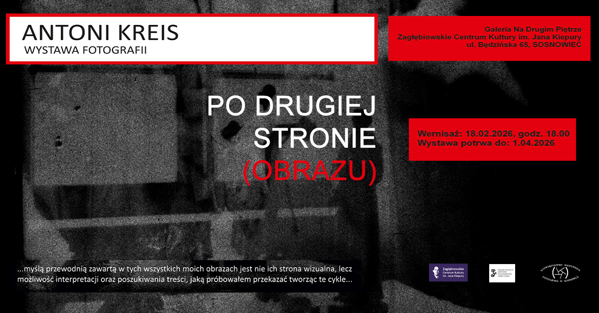Zagłębiowskie Centrum Kultury w Sosnowcu, zaprasza 18 lutego 2026 roku, o godz. 18.00 do Galerii na Drugim Piętrze na wernisaż wystawy fotografii Antoniego Kreissa "Po drugiej stronie (obrazu)". Wystawę można oglądać do 1 kwietnia 2026 roku. Wstęp wolny.