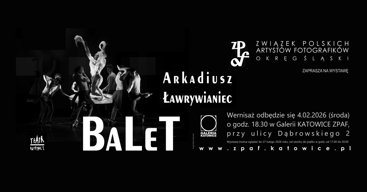ZPAF Okręg Śląski zaprasza w środę 4 lutego 2026 roku o godz. 18.30 do Galerii Katowice ZPAF w Katowicach na wernisaż wystawy fotografii "BaLeT" której autorem jest Arkadiusz Ławrywianiec. Wystawę można oglądać do 27 lutego 2026 roku. Wstęp wolny.