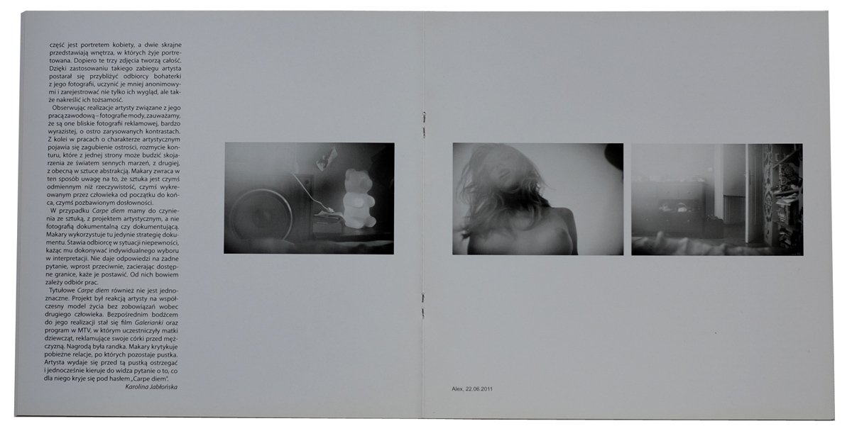 Katalog wystawy fotografii Borysa Makarego pt. "Carpe diem" która miała miejsce w Galerii FF w Łodzi w 2013 roku. Katalog wydany przez Galerię Forum Fotografii która działa w Łódzkim Domu Kultury.