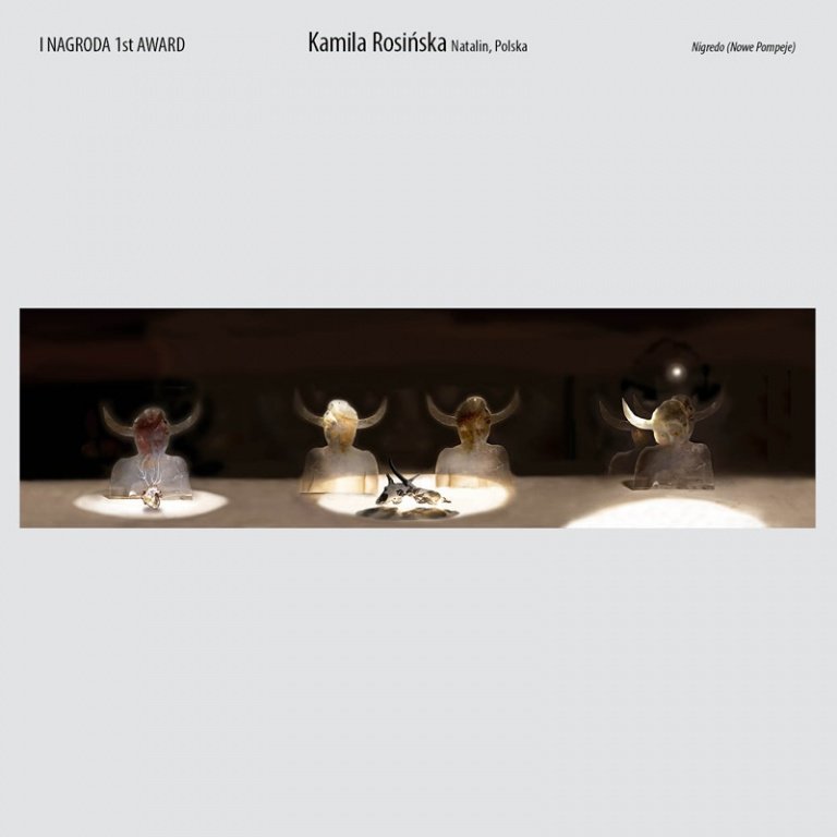 I miejsce zdobyła Kamila Rosińska za pracę pod zagadkowym tytułem Nigredo (Nowe Pompeje). Na pozór jest to praca mało atrakcyjna pod względem wizualnym. Ale wnikając w jej szczegóły i poszczególne fragmenty odkrywamy wiele intrygujących znaków i symbolicznych przekazów, które z jednej strony wynikają z zainteresowań szamanizmem i afrykańskim animizmem, a z drugiej są refleksją wynikłą z wizyty w ruinach Pompei, w tym w Willi Misteriów z zachowanymi słynnymi freskami na temat inicjacji.