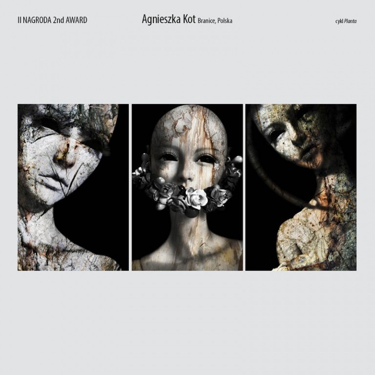 II miejsce zdobyła Agnieszka Kot za cykl Planta, który jest dojrzałym pod względem artystycznym i formalnym ukazaniem fenomenu kobiecości. Technika fotomontażu posłużyła do ukazania zmiennej istoty kobiety, która utożsamiona została z roślinnością. Oczywiście sam pomysł sięga do dokonań takich słynnych artystów, jak Sandro Botticelli, Alfons Mucha czy Stanisław Wyspiański, który nie zdążył zrealizować się w malarstwie olejnym, tylko w szybkiej technice pastelu. Prace Agnieszki Kot wpisują się w problem melancholii, która jest zadumą nad istotą piękna, jego stałością i przemijalnością. A może nawet nad jego ułudą, gdyż prace są montażami.[²] Cykl pokazuje popękaną strukturę twarzy w formie przypominjącej starą tkankę architektoniczną. Twarz kobiety może też być twarzą manekina lub cyborga. Kobiecość zmienia się i nieustannie przeobraża, ale jest w dalszym ciągu zagadką. Autorka w tym cyklu posługuje się wyrafinowanymi składnikami malarskimi, także z wykorzystaniem możliwości abstrakcji. Ciemne tło dodatkowo nadaje rysu tajemniczości, jak to było u wielkich mistrzów epoki baroku: Caravaggia i Rembrandta. Szczególne wrażenie zrobiła na mnie praca z wiankiem kwiatów znajdującym się na wysokości ust. Być może jest to metafora milczenia kobiet, także o rysie sakralnym nawiązującym do tradycji malarstwa religijnego.
