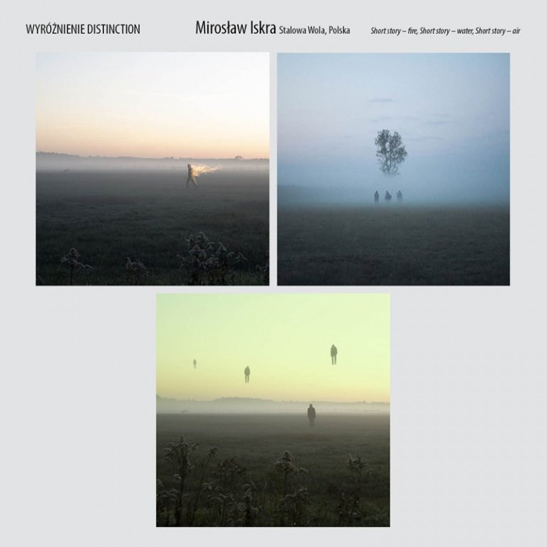 Kolejne wyróżnienie dostał Mirosław Iskra za trzy malarskie prace. Swym ogólnym klimatem przypominają one obrazy Karola Palczaka - zwycięzcy w 2019 roku najważniejszego polskiego konkursu malarskiego Bielska Jesień organizowanego w Bielsku Białej. Malarstwo utalentowanego Palczaka, jak przypuszczam, zostało nagrodzone z powodów politycznych, nie zaś artystycznych.[³] Atrakcyjne wizualnie prace Iskry trudno połączyć za pomocą spójnej idei. Najbardziej przekonywujący jest obraz z płonącym człowiekiem, mniej trzy postaci w mgle, a najmniej trzy postaci unoszące się ku górze. Ta próba metafory nie powiodła się albo nie została odczytana przez jury. Może była zbyt skomplikowana? Niemniej prace Iskry na temat zagrożenia i wyobcowania warte są uwagi.