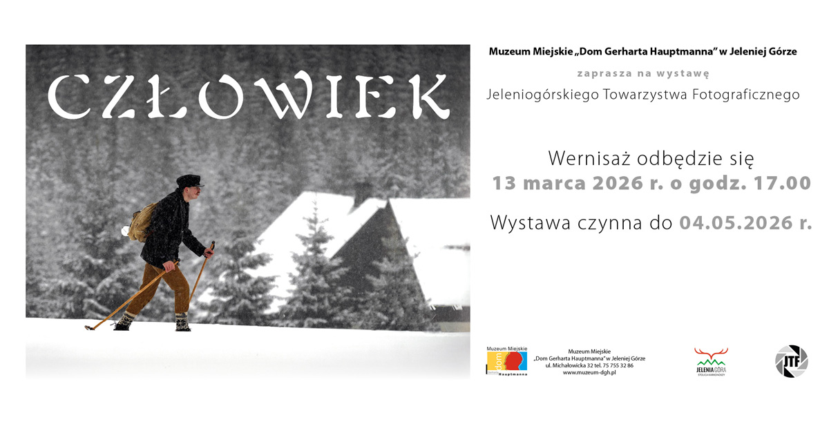 Muzeum Miejskie Dom Gerharta Hauptmanna w Jeleniej Górze zaprasza 13 marca 2026 roku, o godz. 17.00 na wernisaż zbiorowej wystawy fotografii "Człowiek" członków Jeleniogórskiego Towarzystwa Fotograficznego. Wystawę można oglądać do 4 maja 2026 roku. Wstęp wolny.