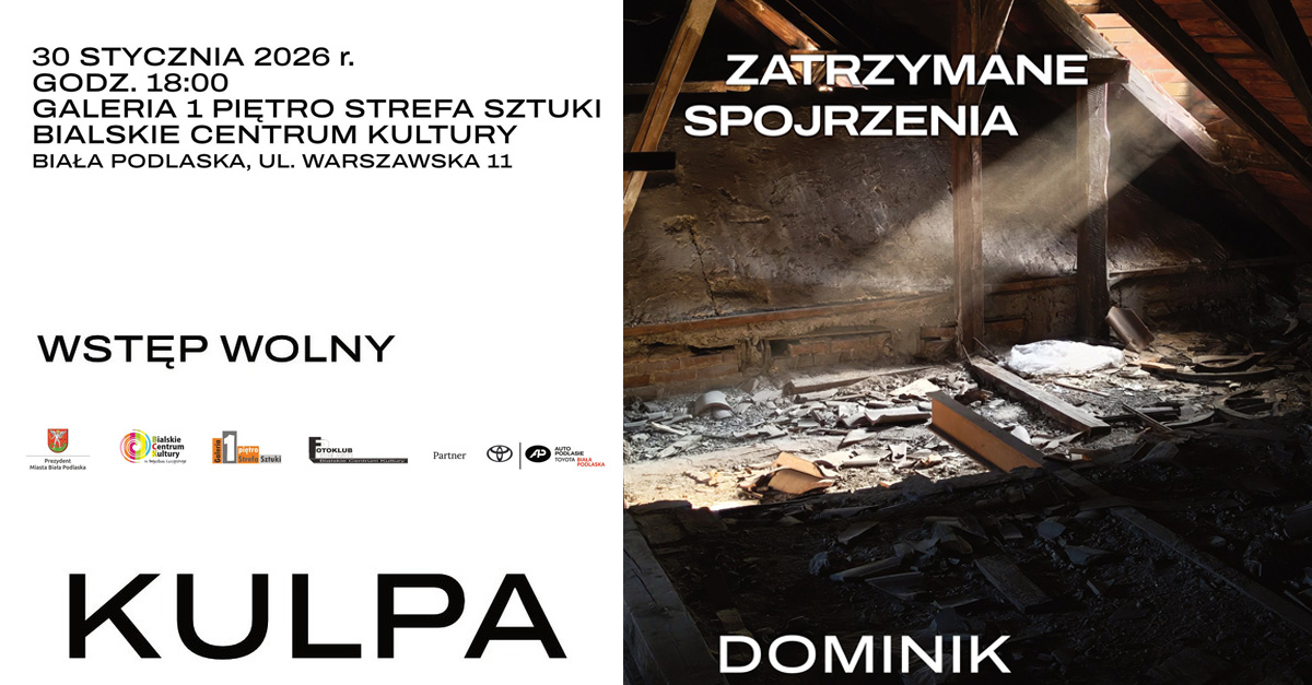 Galeria 1 Piętro Strefa Sztuki w Białej Podlaskiej zaprasza od 30 stycznia 2026 roku, o godz. 18.00 na wystawę fotografii Dominika Kulpy "Zatrzymane Spojrzenia".Wstęp wolny.