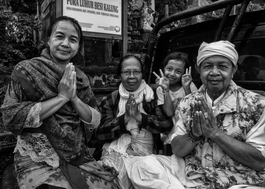 To był początek 2020 roku. Zostałam zaproszona do tworzenia projektu telewizyjnego "Hotel Paradise" realizowanego w Indonezji na wyspie Bali. 80 dni dookoła świata Bali było dla mnie czasem intensywnej pracy, radości, wielu wzruszeń, ale przede wszystkim poznawania i odkrywania zupełnie innej kultury, tradycji i zwykłego życia Indonezyjczyków. Zachwyciła mnie atmosfera miejsc, ezoteryczność tamtejszych ceremonii, ale przede wszystkim niezwykłość prostych ludzi. Postanowiłam czas wolny od pracy wykorzystać między innymi na poznawanie codzienności życia moich „sąsiadów” z okolic Tangguntiti, Tabanan, Krambitan. Wędrując wiejskimi drogami i polnymi ścieżkami podglądałam ich podczas prac na polach, łowieniu ryb, modlitwie, przygotowaniu darów dla swoich Bogów. Utrwaliłam wiele momentów naszych krótkich i dłuższych spotkań. Moim asystentem podróży stał się rower. Niespieszny, wydający dźwięki klekocącego błotnika - zwracał uwagę. Tak, jadąc rowerem dawałam się zauważyć. Wiele ludzi mnie pozdrawiało, jedni pytali co ja tu robię, skąd jestem, inni zapraszali do swoich domów. To co mnie ujęło najbardziej u Balijczyków to spokój, dobroć, życzliwość i uśmiech, który zawsze malował się na ich twarzach. Czułam ogromną potrzebę utrwalenia tych spojrzeń, gestów, uśmiechów. Chciałam ich też tak zapamiętać. Sama mam raczej pogodną naturę. W rozmowach podkreślali, że chcą tacy być bo – Karma wraca. Często zmęczeni, zapracowani, wyrwani ze swoich codziennych zajęć, godzili się na zrobienie im tego jednego zdjęcia. Wiem, że Ci ludzie stali się częścią mojego życia i podróży po Bali. Ta wystawa jest ukłonem w ich stronę…