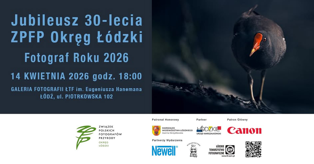 Galeria Fotografii ŁTF im. Eugeniusza Henemana w Łodzi zaprasza 14 kwietnia 2026 roku, o godz. 18.00 na wernisaż zbiorowej wystawy fotografii "Fotograf Roku 2026" zorganizowanej z okazji jubileuszu 30-lecia ZPFP Okręg Łódzki. Wstęp wolny.