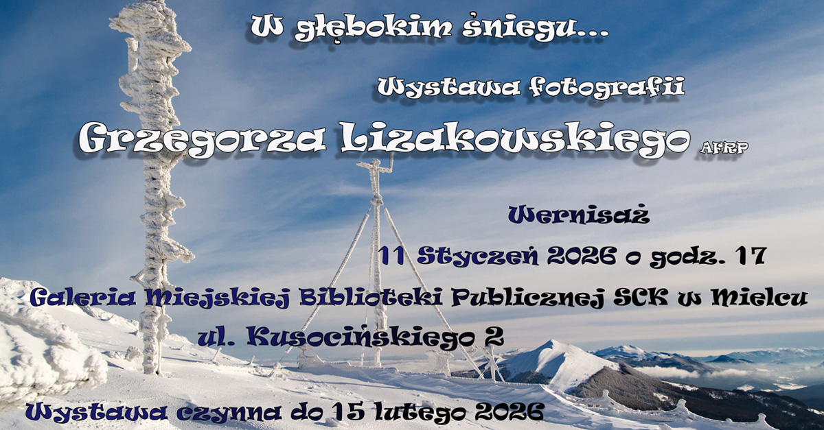 Galeria Miejskiej Biblioteki Publicznej S.C.K w Mielcu zaprasza 11 stycznia 2026 roku, o godz. 17.00 na wernisaż wystawy fotografii Grzegorza Lizakowskiego "W głębokim śniegu". Wystawa potrwa do 15 lutego 2026 roku. Wstęp wolny.