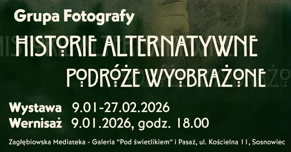 Zagłębiowska Mediateka w Sosnowcu zaprasza 9 stycznia 2026 roku, o godz. 18.00 do Galerii Pod Świetlikiem na otwarcie zbiorowej wystawy fotografii "Historie alternatywne. Podróże wyobrażone" członków Grupy Fotografy. Wystawę będzie można oglądać do 27 lutego 2026 roku. Wstęp wolny.