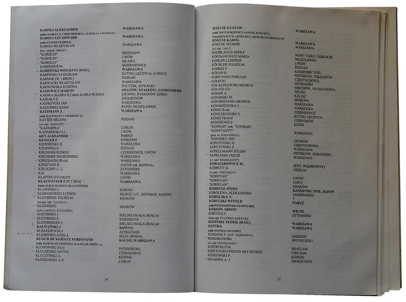 Spis stanowi pierwszy tom słownika, który w dalszych częściach ma zawierać podstawowe dane o polskich mistrzach kamery i prowadzonych przez nich firmach. Poza nazwiskiem i imieniem (lub nazwą zakładu) będzie on uwzględniał następujące dane: miejsce i okres działania, rodzaj wykonywanych zdjęć, sposoby ich sygnowania pełną bibliografię itp. W miarę możliwości zamieszczane będą także krótkie biogramy fotografów. (...)