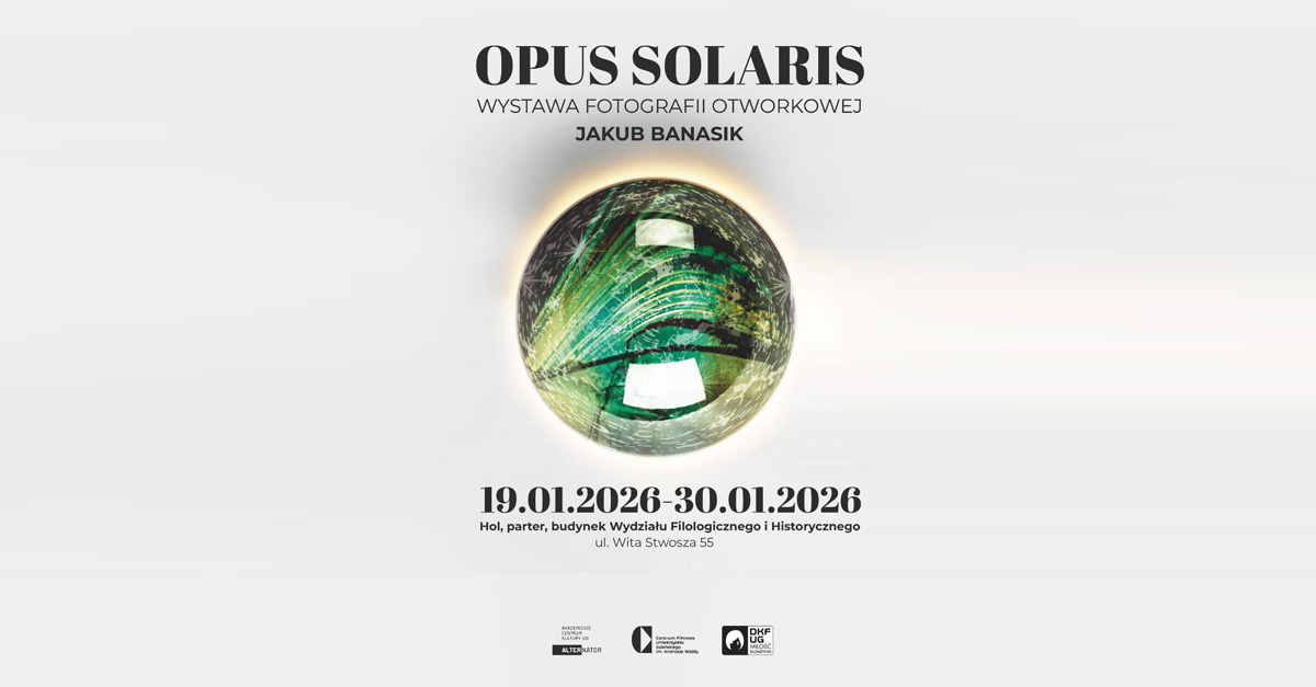 Wydział Filologiczno i Historyczny Uniwersytet Gdański w Gdańsku zaprasza 19 stycznia 2026 roku, o godz. 10.00 do Holu na otwarcie wystawy fotografii Jakuba Banasika "Opus Solaris". Wystawa potrwa do 30 stycznia 2026 roku. Wstęp wolny.