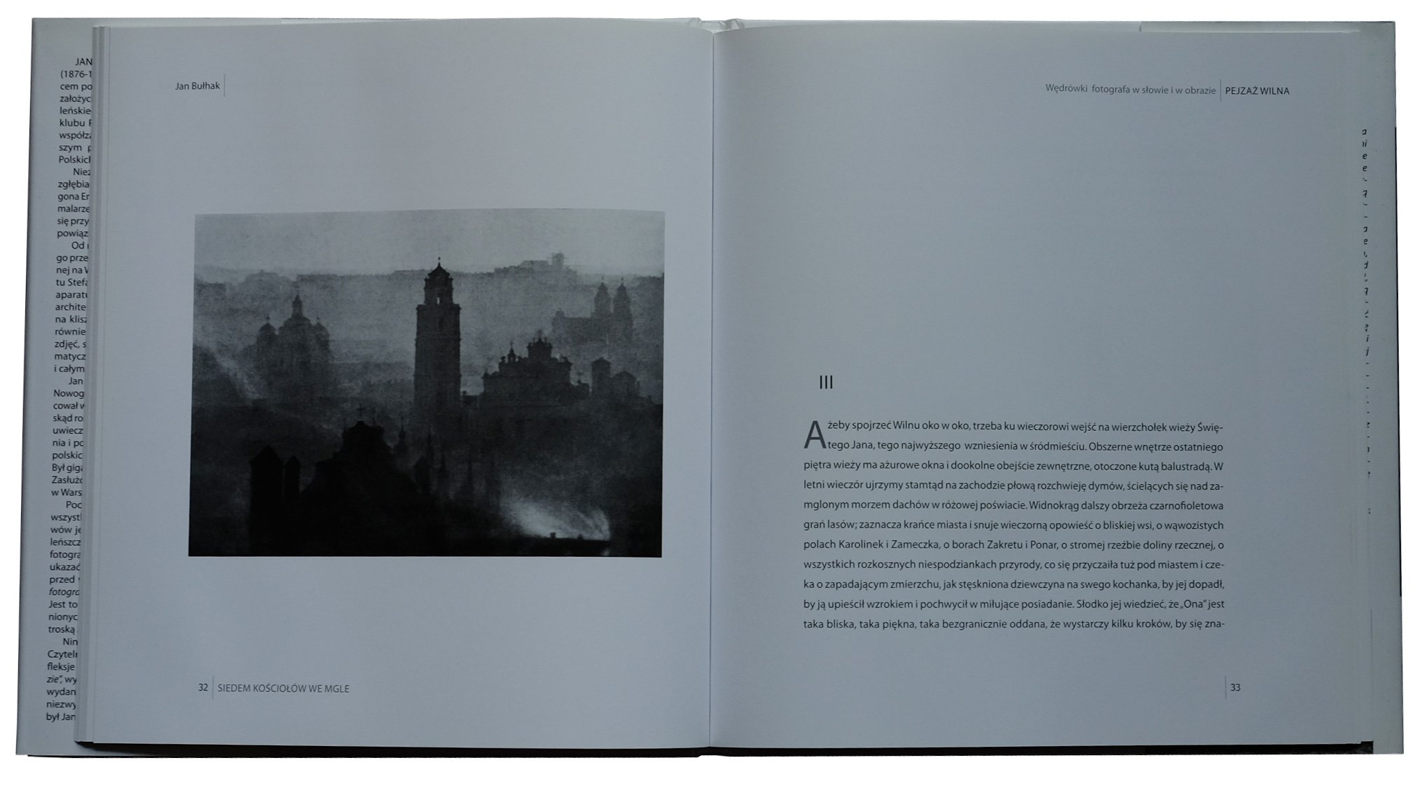 Przed wojną "Pejzaż Wilna" ukazał się w postaci skromnego zeszytu nr VIII-IX, podobnych zeszytów było 17. "Ten jest szczególny, bowiem oprócz pięknych zdjęć Wilna, zakątków i obiektów architektonicznych, zawiera również liryczne opisy miasta i najbliższych okolic" - opowiadała Helena Ostrowska, nie kryjąc, że zdziwieniem napawa fakt, iż Jan Bułhak potrafił operować nie tylko obiektywem, ale i słowem.