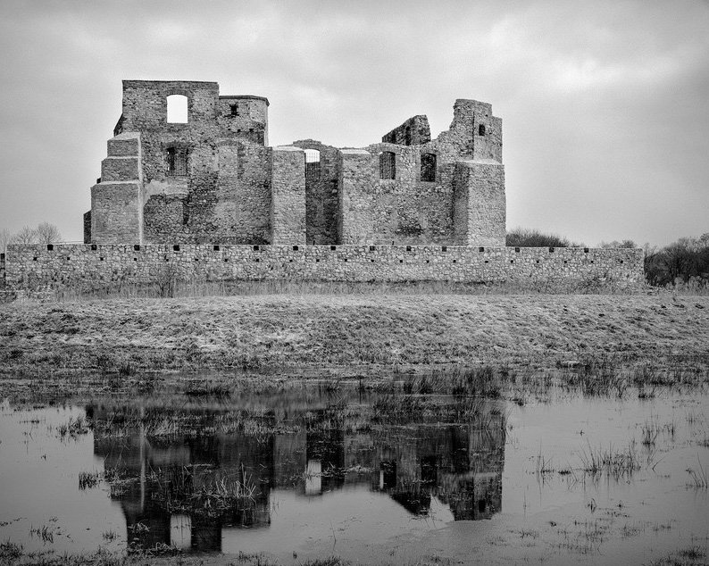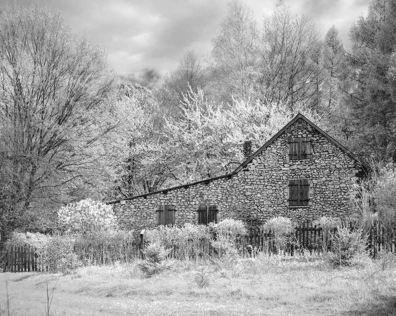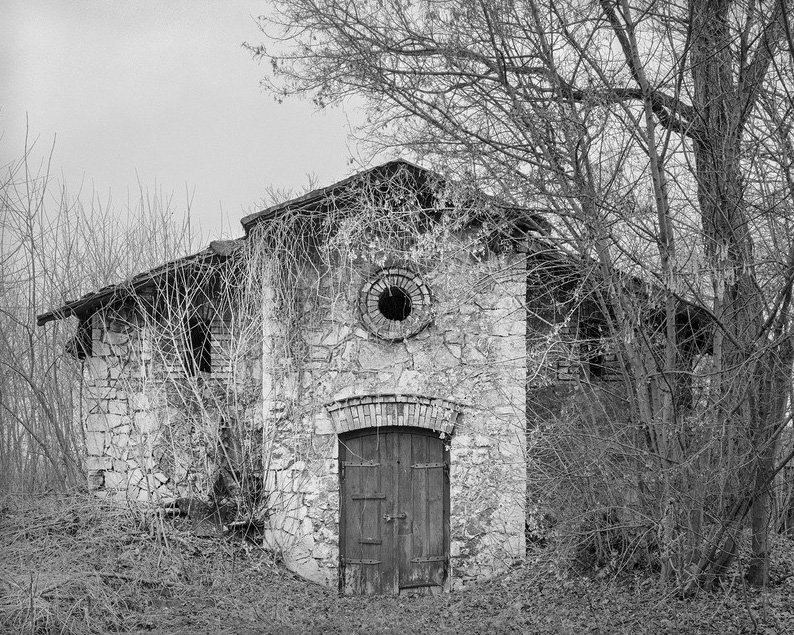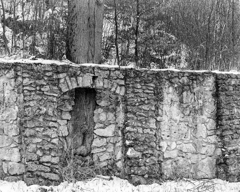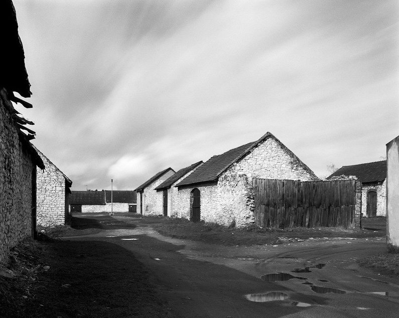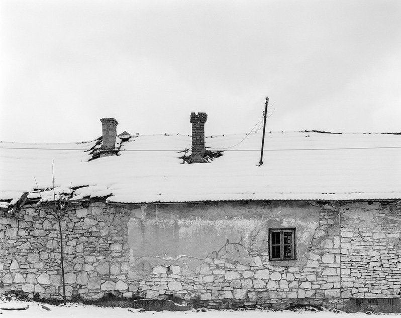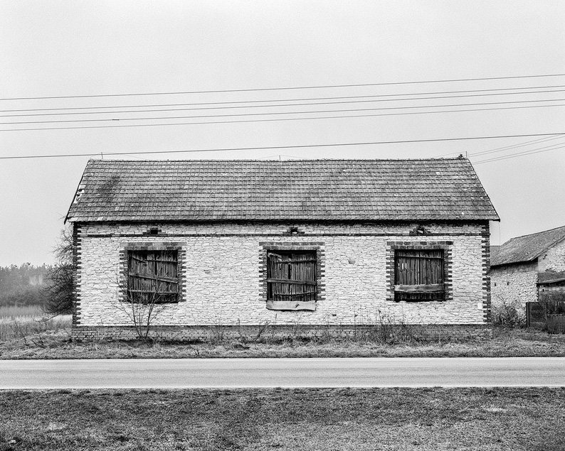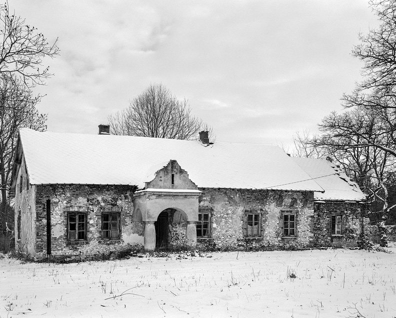 Kamień wapienny jako materiał budowlany jest stosowany od wieków i w różnych regionach kraju. Dla mnie, budynki i budowle z kamienia wapiennego najpiękniej wyglądają na obszarze Jury Krakowsko-Częstochowskiej, wpisując się w krajobraz wapiennych skał, zanurzonych w jurajskiej zieleni, kontrastujących z kolorami jesieni, otulonych bielą zimy. Architektura harmonizuje z otoczeniem i uzupełnia naturalny krajobraz. Średniowieczne warownie, strażnice i zamki, kościoły i kapliczki, zabudowa osadnicza z budynkami mieszkalnymi i gospodarczymi, obiekty przemysłowe, budynki osiedli robotniczych, mury obronne, ogrodzenia, mury oporowe i inne liczne przykłady ciekawej architektury. Cegła i drewno uzupełniają kamienne mury tworząc ciekawe kompozycje architektoniczne. Kamień wapienny to nie tylko materiał konstrukcyjny, ale również dekoracyjny, służący jako okładzina elewacji, jako materiał licznych detali architektonicznych. Szczególnie, że większość architektury z kamienia wapiennego to architektura rodzima, tworzona przez miejscowych rzemieślników. Ich umiejętności i fantazja służyły nie tylko funkcjom obiektu, ale często podkreślały indywidualność wykonawcy. Jurajska architektura interesuje mnie od dawna. Na przełomie lat 2014/2015 wykonałem pierwszą serię zdjęć, w kolorze i za pomocą aparatu cyfrowego. Temat interesuje mnie i wciąga nadal, kusi potrzebą dokumentowania z powodu obserwowanych zmian jakie zachodzą. Wapienna architektura znika z krajobrazu. Budynki i budowle są tynkowane, osłaniane sidingiem, ocieplane styropianem. Znaczna część z nich, nie zamieszkiwana, nie eksploatowana, rozpada się, tworząc ruiny, zarastane z czasem przez roślinność. Część kamiennych obiektów jest burzona i znika bezpowrotnie. Krajobraz Jury zmienia się nieustannie. Dokumentuję zatem istniejące jeszcze budynki i budowle, tym razem z pomocą kamery wielkoformatowej 4×5 cala na czarno-białych materiałach analogowych.