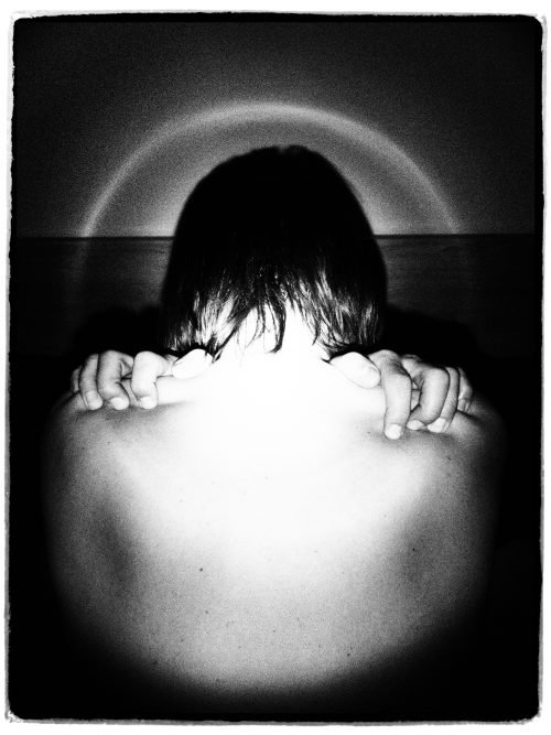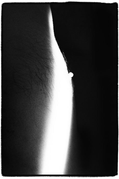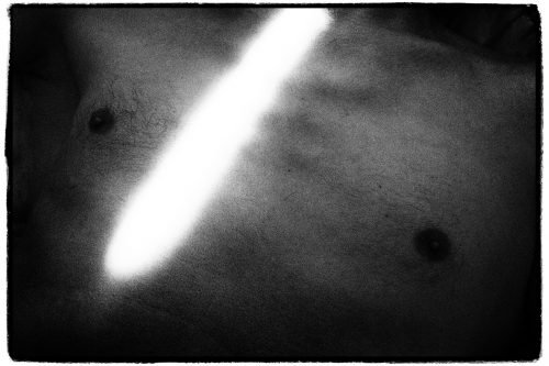 Fotografując patrzę inaczej niż na co dzień. Trzymam w dłoni magiczne narzędzie do rozdzierania obrazu ciała na przeciwległe strefy światła i cienia. Aparat jest wyrazistym medium, które pozostawia silne piętno w dziele. Znajduje się pomiędzy odbijającymi się w sobie – powierzchnią skóry i światłoczułym podłożem. Przez wizjer szukam przesmyków słońca. Uważnie wpatruję się w promienie rysujące na skórze obrazy. Fale światła są nośnikiem widzialności fotografowanego męskiego ciała. Odmalowują czarno-białe formy, w których zakotwiczone zostaną pojęcia, sensy i ciągi znaczeń. To one stworzą obraz zredukowany do świetlistego odbicia, do zapisu odblasków światła na powierzchni ciała. Światło ostro odmalowuje materialną strukturę, a cień – poprzez niedopowiedzenie -przybliża jego tajemnice, współtworzy dualistyczny obraz magicznej całości. Zmaterializowanej więzi dotykającego skórę światła i jego dwuwymiarowego zapisu.