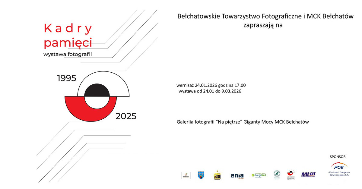 Miejskie Centrum Kultury w Bełchatowie oraz Bełchatowskie Towarzystwo Fotograficzne zaprasza 24 stycznia 2026 roku, o godz. 17.00 do Galerii Fotografii "Na Piętrze" na otwarcie zbiorowej wystawy fotografii "Kadry pamięci - 30 lat Fotoklubu RP". Wystawa potrwa do 9 marca 2026 roku. Wstęp wolny.