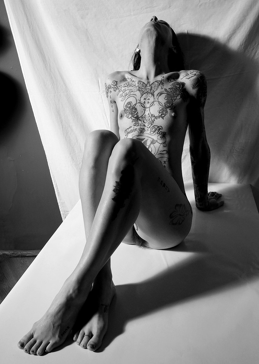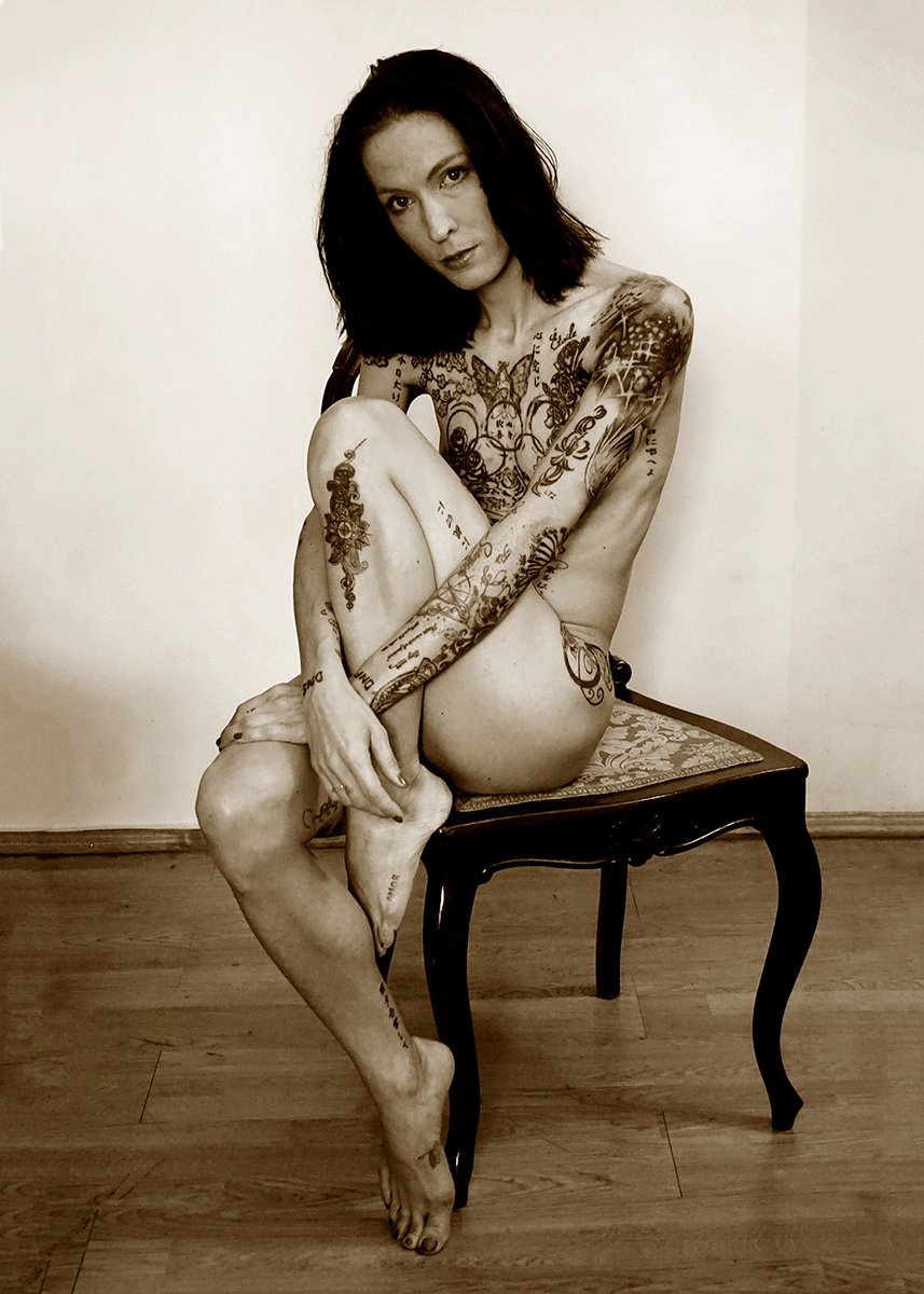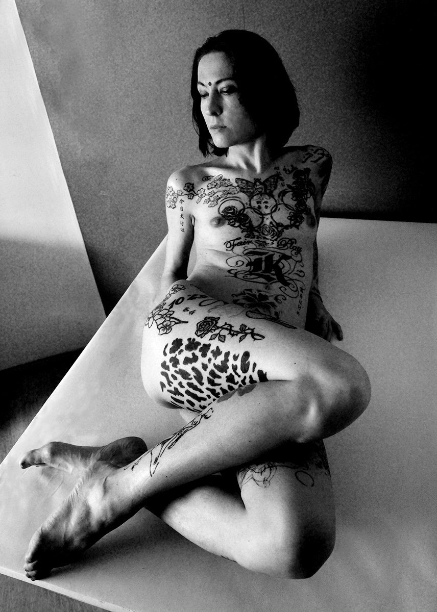 Kiedy zaprzyjaźniony kolega fotograf powiedział mi, że ma modelkę, która marzy o tym żebym zrobił jej zdjęcia, nie miałem na to najmniejszej ochoty, tym bardziej kiedy dowiedziałem się, że jest cała wytatuowana. Kiedy jednak ją zobaczyłem, zrobiło mi się jej żal i zaproponowałem, że zrobię jej kilka portretów i jeśli będzie chciała to również aktów – chciała. Kiedy się rozebrała, po raz pierwszy w życiu zobaczyłem takiego dziwoląga pokrytego tatuażami i kolczykami w różnych częściach jej bardzo zgrabnego ciała. Kiedy już w mojej pracowni zobaczyłem rezultat naszej pracy, zdziwiłem się, że zrobiłem tyle świetnych zdjęć, może dlatego właśnie, że Nina bardzo mi się nie podobała.