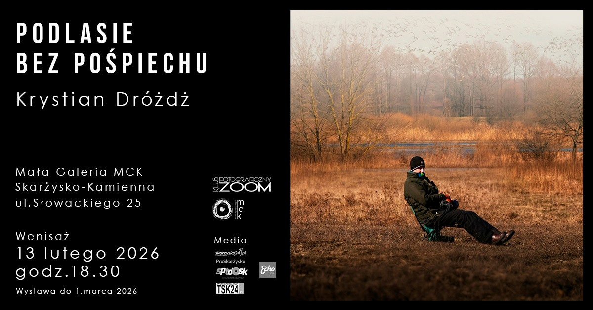Miejskie Centrum Kultury im. Leopolda Staffa w Skarżysku-Kamiennej, zaprasza 13 lutego 2026 roku, o godz. 18.30 do galerii MCK na wernisaż wystawy fotografii Krystiana Dróżdża "Podlasie bez pośpiechu". Wystawę można oglądać do 4 marca 2026 roku. Wstęp wolny.
