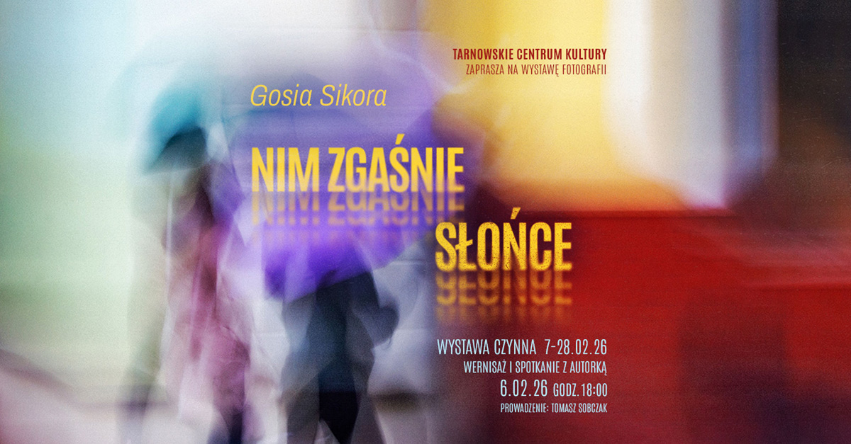 Tarnowskie Centum Kultury w Tarnowie zaprasza 6 lutego 2026 roku, o godz. 18.00 do Galerii TCK na wernisaż wystawy fotografii Małgorzaty Sikory "Nim zgaśnie Słońce" spotkanie poprowadzi Tomasz Sobczak. Wystawę można oglądać do 28 lutego 2026 roku.