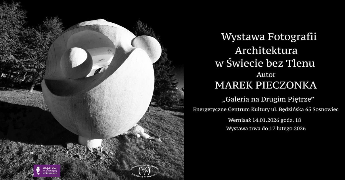 Energetyczne Centrum Kultury w Sosnowcu zaprasza 14 stycznia 2026 roku, o godz. 18.00 na wernisaż wystawy fotografii Marka Pieczonki "Świat bez tlenu". Wystawa potrwa do 17 lutego 2026 roku. Wstęp wolny.