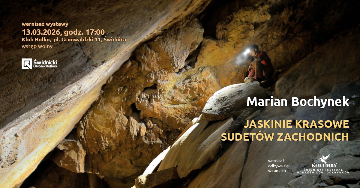 Świdnicki Ośrodek Kultury w Świdnicy zaprasza 13 marca 2026 roku, o godz. 17.00 do klubu Bolko na wernisaż wystawy fotografii Mariana Bochynka "Jaskinie krasowe Sudetów Zachodnich". Wstęp wolny.