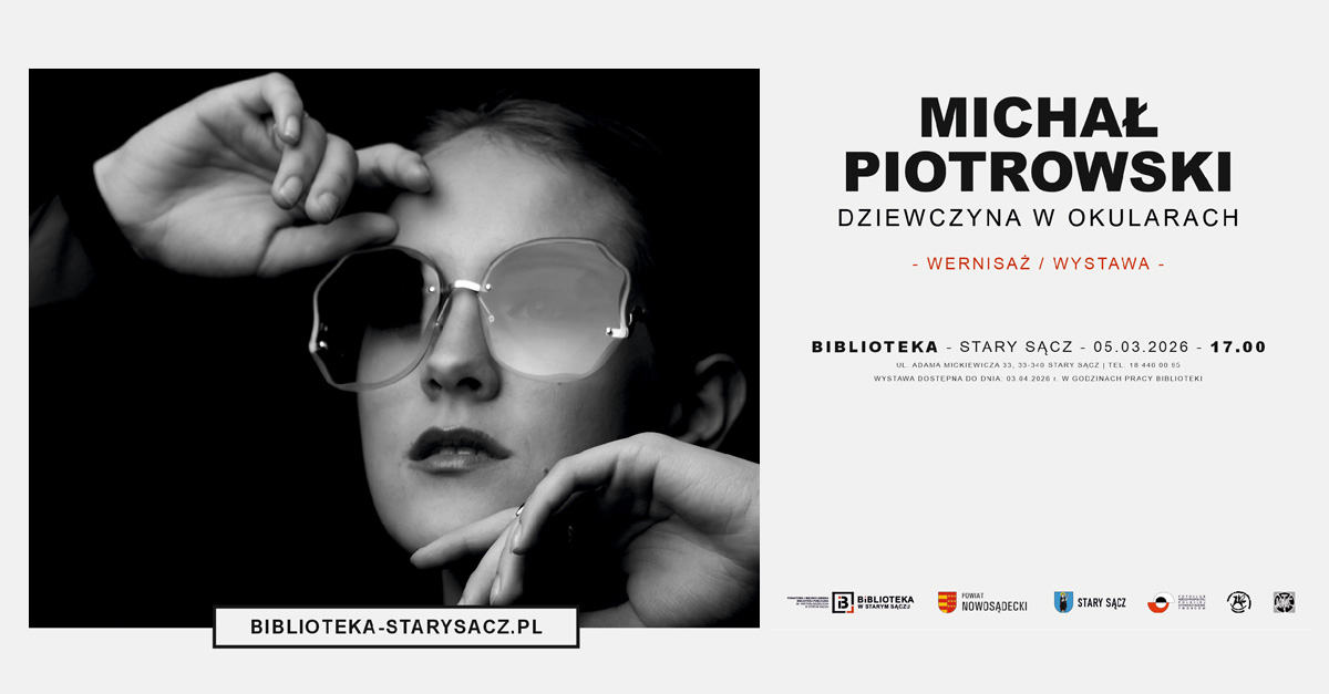 Miejska Biblioteka w Starym Sączu zaprasza 5 marca 2026 roku, o godz. 17.00 na wernisaż wystawy fotografii Michała Piotrowskiego "Dziewczyna w okularach" odsłona V. Wystawę można oglądać do 3 kwietna 2026 roku. Wstęp wolny.