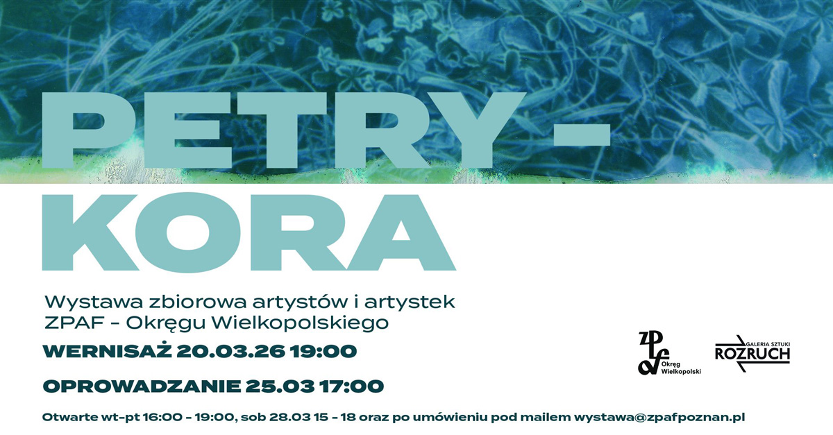 Galeria Sztuki Rozruch w Poznaniu zaprasza 20 marca 2026 roku, o godz. 19.00 na wernisaż zbiorowej wystawy fotografii "Petrykora" artystów i artystek ZPAF - Okręgu Wielkopolskiego. Wystawa potrwa do 2 kwietnia 2026 roku. Wstęp wolny.