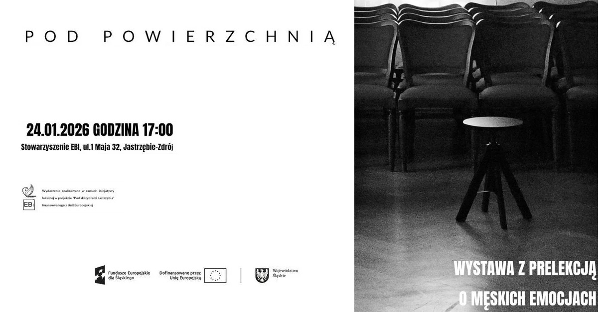 Stowarzyszenia EBI z Jastrzębia Zdroju zaprasza 24 stycznia 2026 roku, o godz. 17.00 na wernisaż wystawy fotografii "Pod powierzchnią" polaczony z prelekcję na temat męskiej emocjonalności, którą poprowadzi Piotr Kozakiewicz. Wstęp wolny.