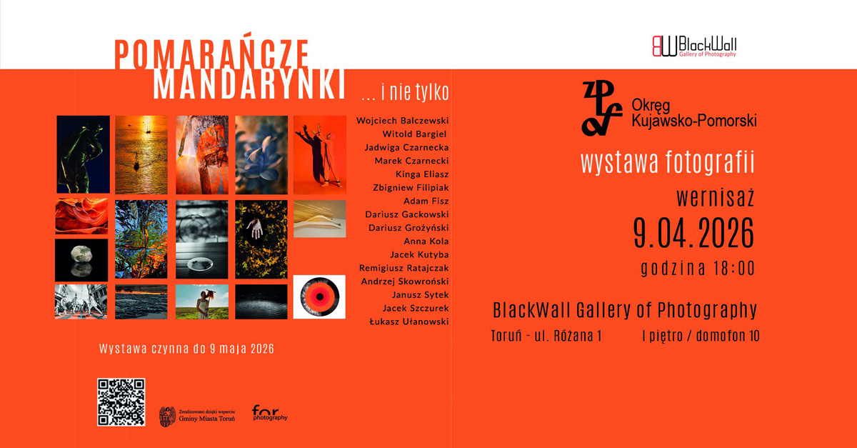 The BlackWall Gallery of Photography w Toruniu zaprasza 9 kwietnia 2026 roku, o godz. 18.00 na wernisaż zbiorowej wystawy fotografii "Pomarańcze, mandarynki i nie tylko" członków Okręgu Kujawsko-Pomorskiego ZPAF. Wystawa potrwa do 9 maja 2026 roku.