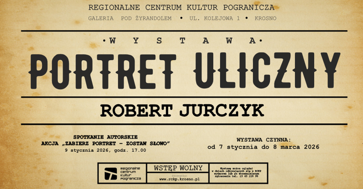 Regionalne Centrum Kultur Pogranicza w Krośnie zaprasza 9 stycznia 2026 roku, o godz. 18.00 na otwarcie wystawy fotografii analogowej Roberta Jurczyka "Portret uliczny", opowiadającą o ludziach spotykanych na ulicach Krosna i poza nim. Wystawę będzie można oglądać do 8 marca 2026 roku. Wstęp wolny.