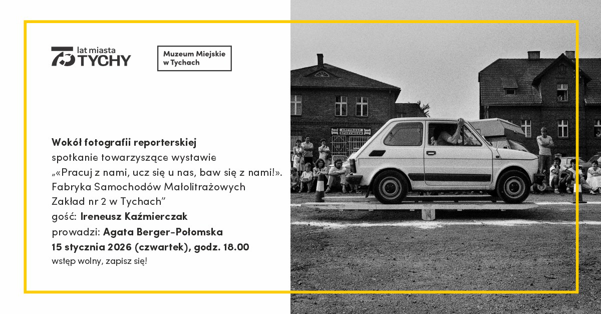 Muzeum Miejskie w Tychach zaprasza 15 stycznia 2026 roku, o godz. 18.00 do Starego Magistratu na spotkanie "Wokół fotografii reporterskiej" z Ireneuszem Kaźmierczakiem towarzyszące wystawie "Pracuj z nami, ucz się u nas, baw się z nami!». Fabryka Samochodów Małolitrażowych Zakład nr 2 w Tychach". Wstęp z wolny.