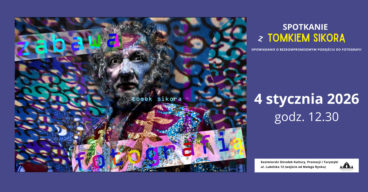 Kazimierski Ośrodek Kultury, Promocji i turystyki w Kazimierzu Dolnym zaprasza 4 stycznia 2026 roku, o godz. 12.30 na spotkanie z Tomkiem Sikorą "Zabawa Fotografią" na którym opowie o bezkompromisowym podejściu do fotografii, która otwiera przed twórcą nieskończoną przestrzeń do poszukiwań i eksperymentowania. Wstęp wolny.