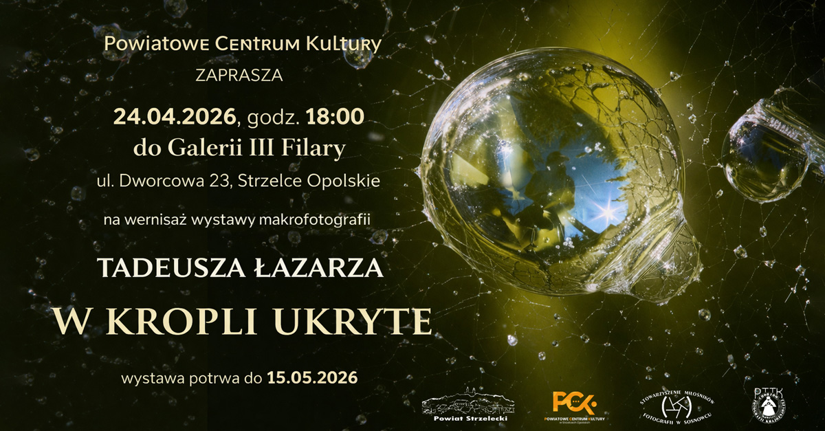 Powiatowe Centrum Kultury w Strzelcach Opolskich zaprasza 24 kwietnia 2026 roku, o godz. 18.00 do Galerii III Filary na wernisaż wystawy fotografii Tadeusza Łazarza "W kropli ukryte". Wystawa potrwa do 17 maja 2026 roku. Wstęp wolny.
