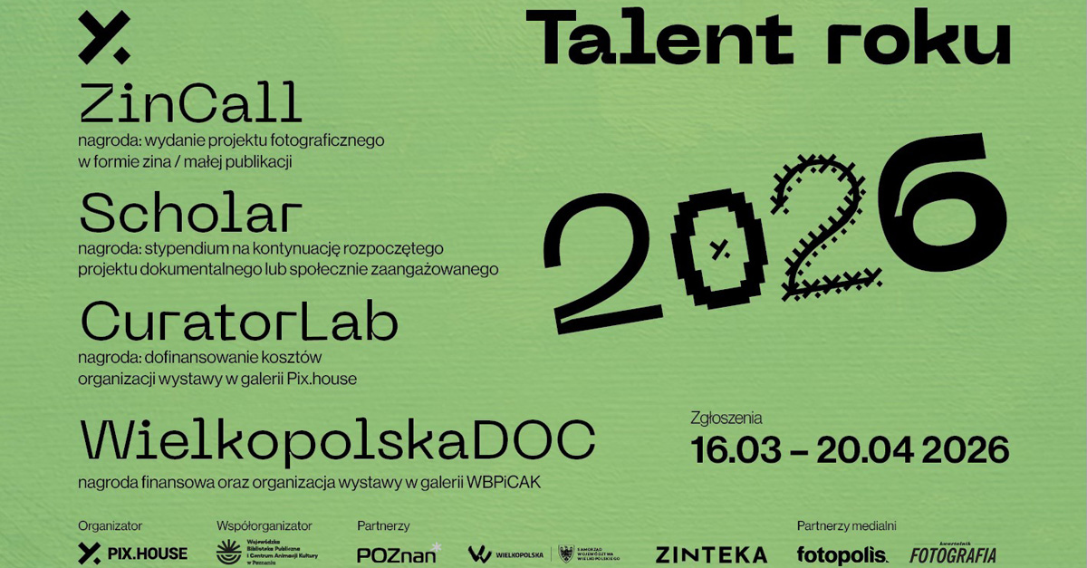 Galeria Pix.house w Poznaniu zaprasza do udziału w konkursie "Talent Roku 2026" który wspiera rozwój projektów fotograficznych i tworzy przestrzeń dla opowieści o człowieku i współczesnym świecie. Termin nadsyłania prac upływa 20 kwietnia 2026 roku. Rozstrzygnięcie konkursu nastąpi do 18 maja 2026 roku.