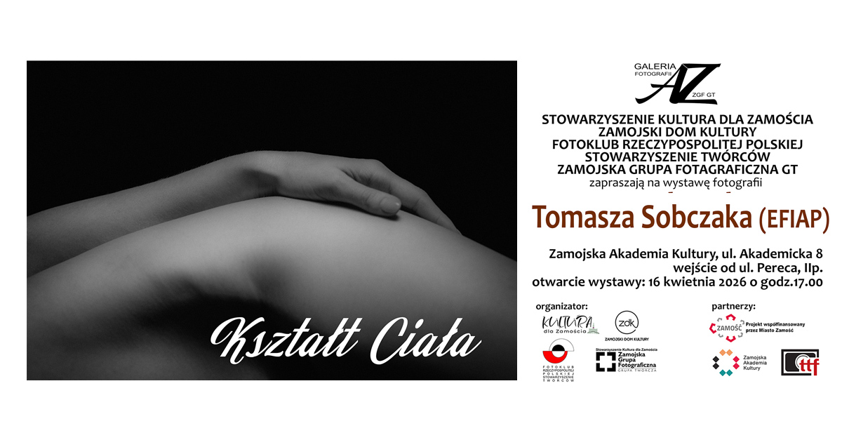 Zamojska Akademia Kultury w Zamościu zaprasza 16 kwietnia 2026 roku, o godz. 17.00 do Galerii AZ na wernisaż wystawy fotografii Tomasza Sobczaka "Kształt Ciała". Wstęp wolny.
