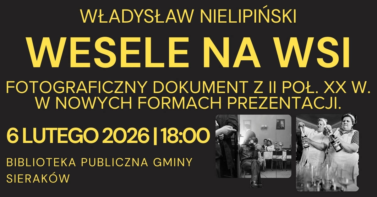 Biblioteka Publiczna Gminy Sieraków zaprasza 6 lutego 2026 roku, o godz. 18.00 na wernisaż wystawy Władysława Nielipińskiego "Wesele na wsi", czyli fotograficznego dokumentu z II połowy XX wieku. Wstęp wolny.