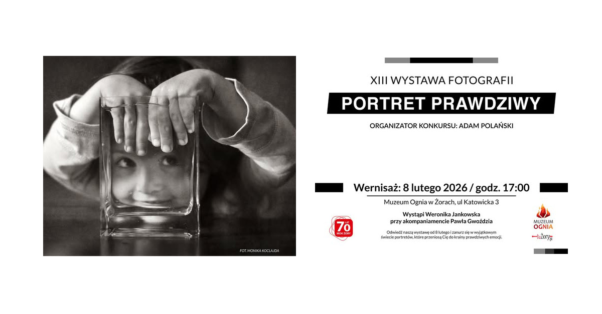 Zapraszamy 8 lutego 2026 roku, o godz. 17.00 do Muzeum Ognia w Żorach na wernisaż międzynarodowej pokonkursowej wystawy fotografii "XIII Portret Prawdziwy", oprawę muzyczną zapeni Weronika Jankowska z akompaniamentem Pawła Gwoździa. Wystawa potrwa do 28 lutego 2026 roku.