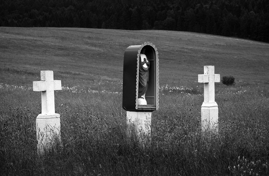 "Łemkowyna" to podróż w głąb historii i po obszarach współczesności. Wybijającym się elementem, obecnym na co trzeciej z prezentowanych fotografii jest krzyż. Krzyż ma znaczenie wielorakie, jestoczywiście symbolem śmierci, ale także odradzającego się życia i nadziei. Prawosławny krzyż Łemków - trzybelkowy, jak pisał Petro Murianka „rozpięty na siedem stron świata z krzykiem wiatru w drzazgach (…) ”* jest kotwicą łemkowskiej tożsamości narodowej, świadectwem przynależności do ziemi, pamięcią zbiorową, rękojmią dziedzictwa. Dlatego, nierzadko ukwiecony, zadbany i otoczony prowizorycznym płotkiem, traktowany jest jak unikatowe, drogocenne dzieło chronione w depozycie muzealnym.